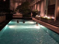 また、このコンドミニアムの屋上には夜にはライトアップされるプールがある為、プールサイドに酒を持っていき、