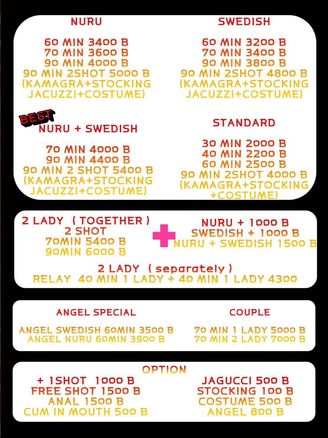 定番の スウェディッシュオイルマッサージ をはじめ、ヌルヌルマッサージや韓国スタイルの施術など、幅広いメニューをラインナップ。